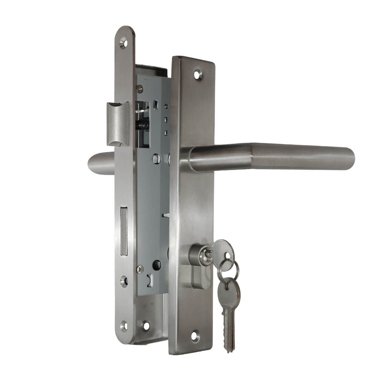 Dankzij de 80 mm maatvoering is de slotset makkelijk te combineren met gangbare deurdiktes. De RVS-afwerking zorgt voor duurzaamheid, slijtvastheid en onderhoudsgemak, waardoor dit product geschikt is voor dagelijks intensief gebruik. Het complete ontwerp maakt de montage eenvoudig en snel, ideaal bij renovatie of vervanging van bestaand deurbeslag.