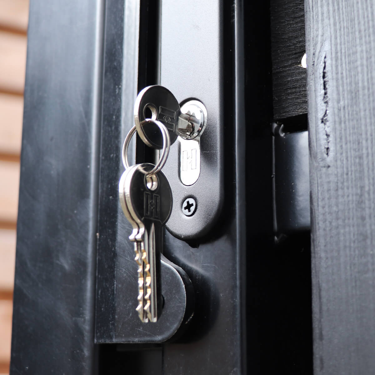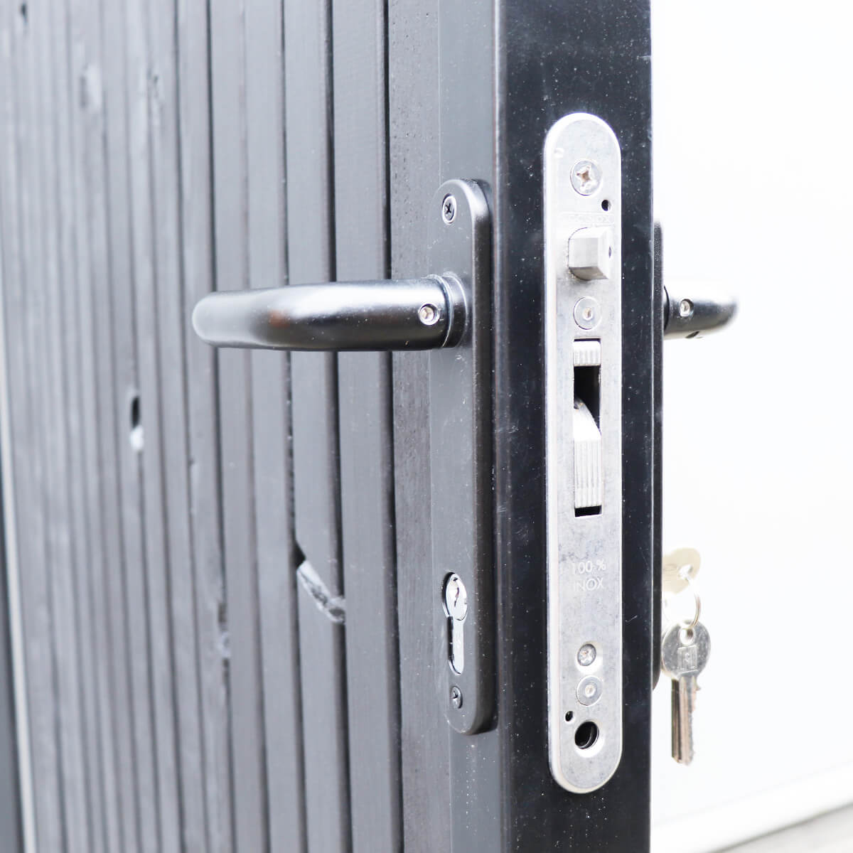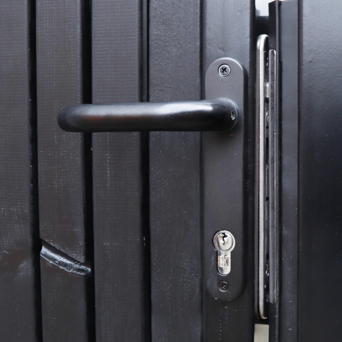 De poort is voorzien van een sterk stalen frame met een duurzame zwarte poedercoating. Het hout bestaat uit zwart gespoten grenen Elan latten, wat zorgt voor een moderne uitstraling en extra bescherming tegen weersinvloeden. Grenenhout is een populaire en betaalbare houtsoort die, in combinatie met de juiste afwerking, zeer geschikt is voor buitengebruik. Het hoogwaardige hang- en sluitwerk van Locinox staat garant voor veiligheid, comfort en een lange levensduur.