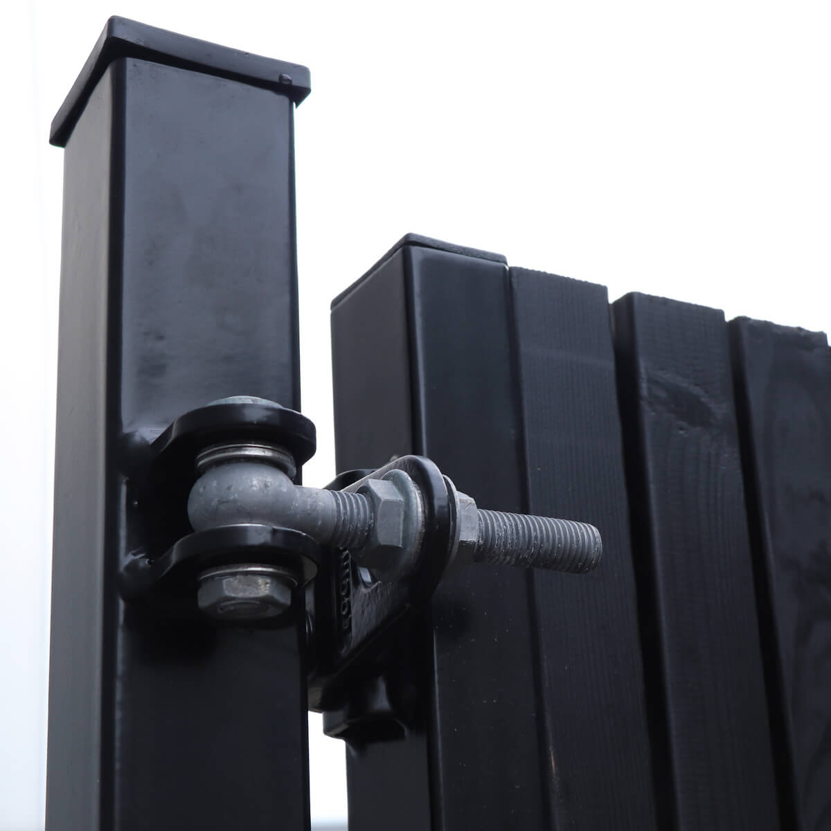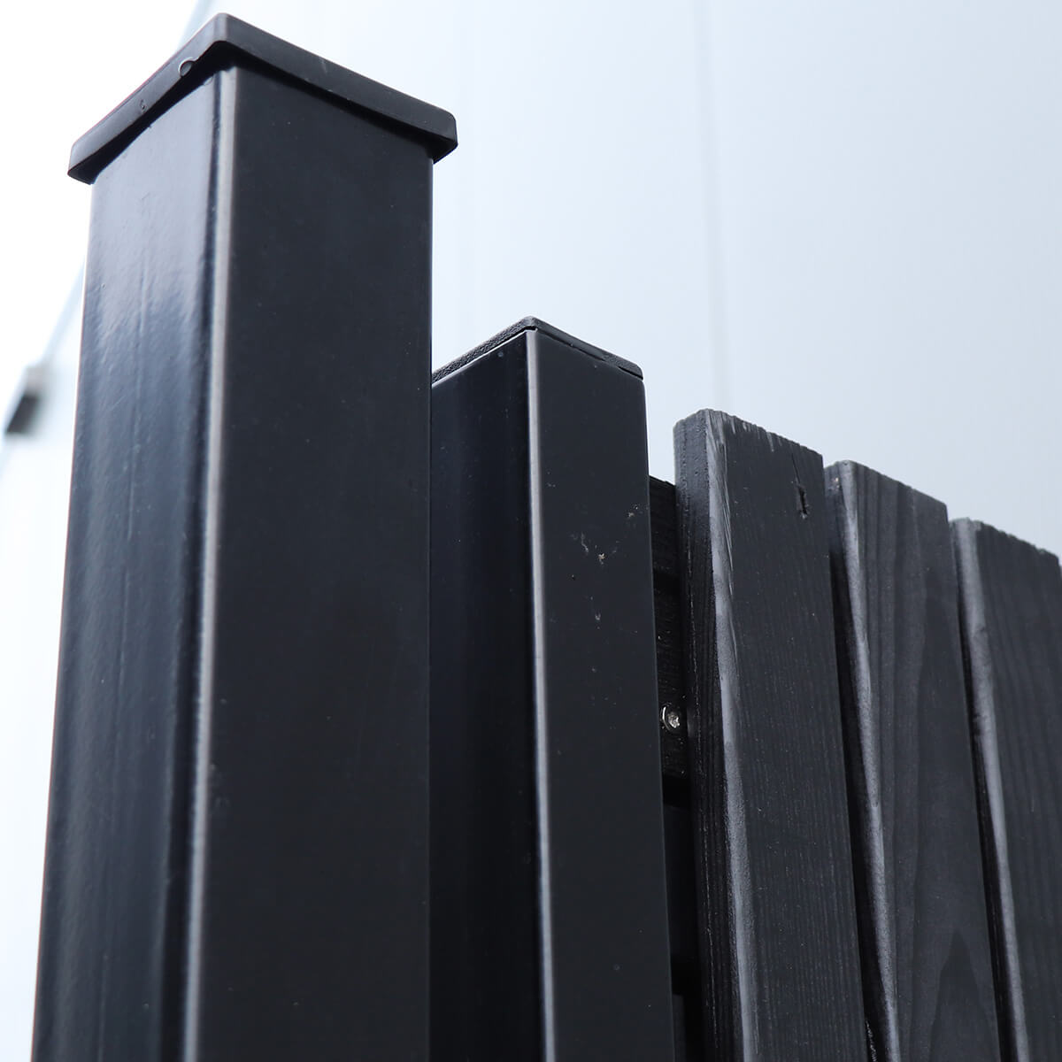 De poort wordt geleverd met een zwarte stalen paal van 60 x 60 mm, eveneens gepoedercoat voor optimale bescherming tegen weersinvloeden. U heeft de keuze uit een paal met voet (geschikt voor montage op een betonpoer) of een paal zonder voet (voor plaatsing in de grond). Hierdoor is de poort in vrijwel iedere situatie toepasbaar. De doorgang bedraagt 100 cm, terwijl de poort zelf inclusief hout 92 cm breed is. De totale breedte inclusief palen komt uit op 111 cm.