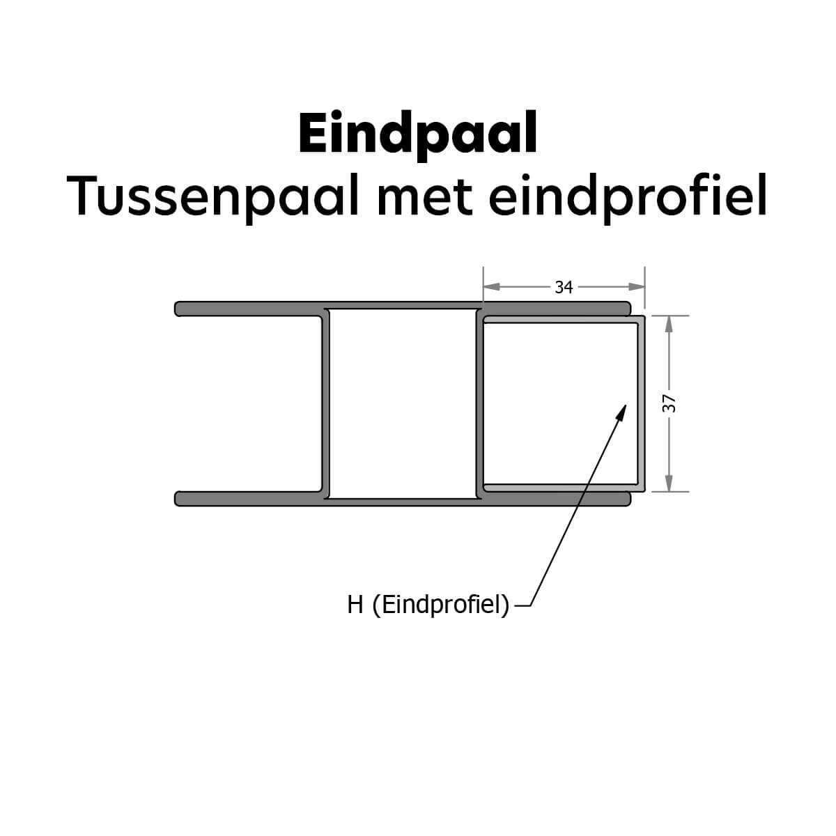 Om uw schutting netjes af te werken aan het einde van een lijn, gebruikt u een eindprofiel in combinatie met een tussenpaal. Hiermee creëert u een strakke eindpaal zonder open gleuf, wat zorgt voor een verzorgde en professionele uitstraling van uw schutting.