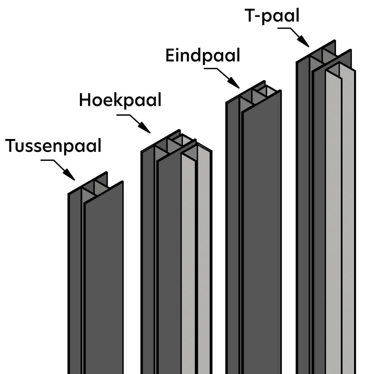 De palen zijn verkrijgbaar in drie lengtes: 184 cm, 275 cm en 300 cm. De kortere varianten worden vaak gebruikt voor schuttingen van ongeveer 100 cm of 200 cm hoog. De 300 cm paal is ideaal wanneer u werkt met dubbele onderplaten om hoogteverschillen in uw tuin op te vangen. U kunt kiezen uit twee moderne kleuren: Zwart (RAL 9005) en Kwartsgrijs (RAL 7039).