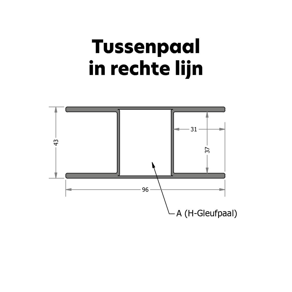 Een tussenpaal verbindt twee schuttingdelen in een rechte lijn. Dit is de meest gebruikte opstelling en zorgt voor een strakke, doorlopende schutting zonder kieren.